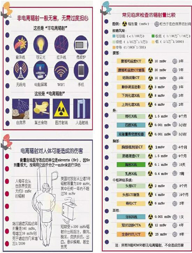 体检车经过几十年的发展越来越先进,DR体检车上面装有车载DR设备??梢宰鲂夭縓光线检查。一台透视仪在体检者胸前来回移动照射,医生在另一头的检查室观察。体检车放射检查的确有利有弊是一把双刃剑,不应检查过度,也不必因此讳疾忌医。因为通过检查可以更加容易对患者的病情确诊,对症下药。放射性体检,对身体或多或少有点伤害,主要的危害是放射检查对我们是通过来自X线产生的电离进行辐射。但是在必须检查的情况下研究表明利大于弊,因为接受一定量的辐射是正常的。体内可以自我修复。一个大人接受一年100毫西弗的辐射对身体没多大伤害的。但是不能过度放射检查。当有必要做的。当数不能过于频繁的情况或逐步改善无显著变化,也没有必要每天进行审查,否则成为放疗的变相。以下是常见临床检查的辐射量比较图
