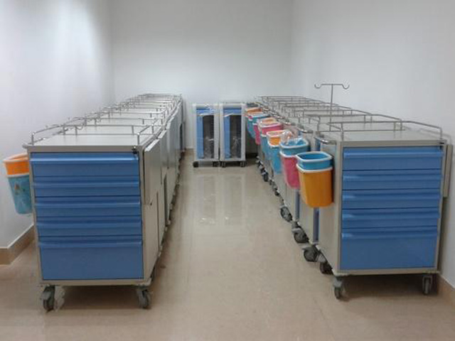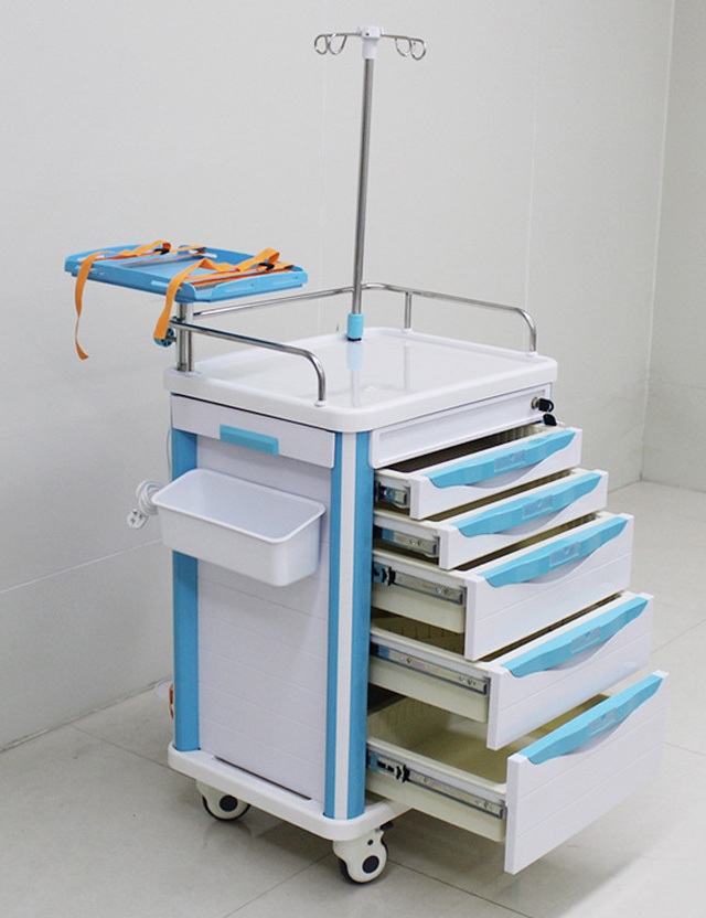 抢救车的基本构造是车体、轮子、还有医用橱柜。橱柜的柜体是放药品的空格。车体有固定氧气瓶的套筒?;古溆惺湟杭?,还有多个放物品的抽屉。盖板可以盖住药物。采用了塑钢材料,包含工作台面,杂物箱,输液架,轮子,垃圾桶。一般分四个层次,急救药品区,放置一定数量的急救药品,根据药品使用频率来依次排列。输液区,放了输液器、注册器、留置针、止血贴、消毒棉、砂轮、等。呼吸物品区,开口器、压舌板、吸氧管、各种型号插管喉镜。其他物品,温度计、血压计、电筒、负压吸引器等。