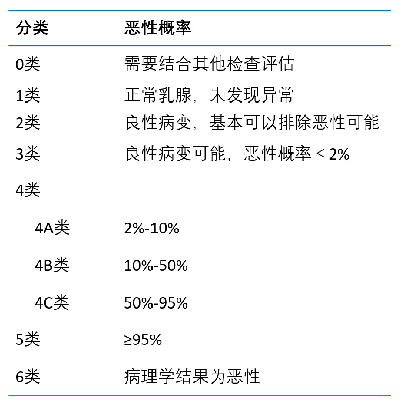 BI-RADS系统可分为0-6类。其中0类指医生怀疑有恶性可能,但是没有从超声检查中获取充分的证据,需要结合其他检查结果评估。其余1-6类,类别越高,恶性概率越高。各类别恶性概率如下表所示。因此,如果看到自己的报告单上写着“BI-RADS 1类”或“BI-RADS 2类”,可以稍稍放下心来,定期复查;如果报告单上写着0类或3、4、5、6类,则需要及时前往医院就诊,请医生给出专业意见。