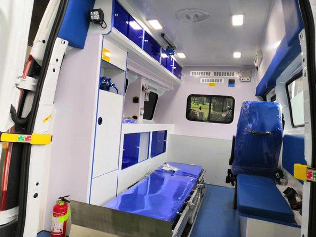 救护车后面的医疗仓改装也是根据国家标准执行的。使用环保无毒,防水,防火的符合材料。里面有集成供氧系统。医疗器械柜子。设计都是很合理的。对医护人员的使用非常方便。救护车的亮度需要更明亮特点。安装了多盏LED灯。整体布局设计都非常合理实用。相对于普通车辆来看。救护车的要求更好。不然一旦发生事故会危及病人生命。