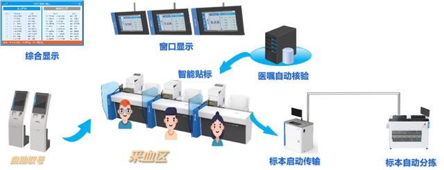 采血流程:患者到窗口采血-扫码或读就诊卡-核对检验项目-打印标签-选择试管-粘贴试管-护士采血。人工采血存在问题人工选管、打印、粘贴,劳动强度大。容易出现人为错误。贴歪、贴倒(不能识别)。位置错误(流水线无法识别)。视窗覆盖(无法观察血液情况)??赡艹鱿致┎苫蚨嗖裳?。智能采血设备解决采血人的排队难题,智能采血管理系统把采血管的准备工作自动化,缩短等待时间。采血流程需要全面的优化,报到取号,65岁以上老人优先。智能叫号不需要长时间的排队。采血管容量大,处理速度快,能有效加快采血速度,提高采血服务质量。自动化代替了传统人工的操作模式。自动识别自动贴标,自动标本核收。大大的减少人工误差。也减少繁杂的采血前准备,系统具有诸多优势,将为客户带来全新的体检体验。