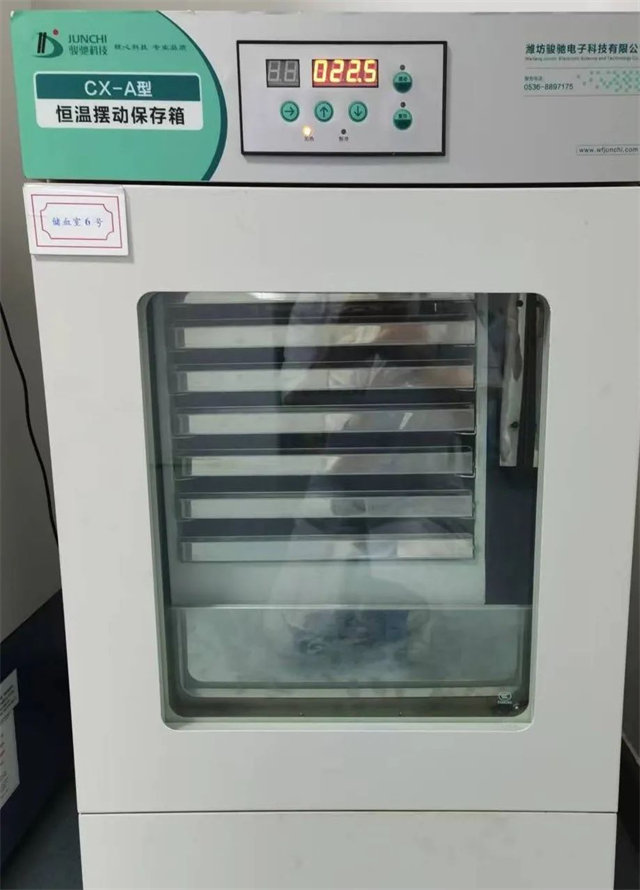 储血室的各种仪器智能采血设备带大家了解一下。储存血小板的恒温摆动保存箱,温度在22摄氏度左右,正负2摄氏度。它的主要功能特点是摆动,摇摆的幅度是5厘米。1分钟摆动频率是60次左右。