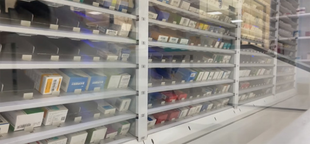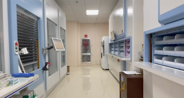 快速出药系统,智能存取系统,混合智能配发系统。出药系统负责盒装药品的发送,智能存取系统负责针剂量小的药品的储存和发放。智能配发系统负责为后台药师降配好的药品药框提供摆放位置的指示,为前台药师提供患者取药时药框位置的指示。针剂发药机的发框设备接收到处方信息后,电脑打印出药品的明细并且弹出药框。药品通过传输带传送,然后到达出药口。针剂区对应药品的药盒会亮灯提示药剂师药品的位置。点击出药确认后会接收下一张处方药品信息。调剂药师核对无误后将药框放到轨道上面。药框通过轨道传送到对应的发药窗口。发药药师根据出发信息点击发药,对应处方的药框亮灯进行提示。发药药师根据处方再次核对药品无误后,粘贴用药标签,进行用药交代,结束发药。