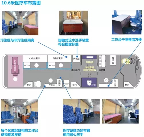 出口的医疗车配置相当的齐全,车长10.6米,总质量有14吨,国六排放标准,搭载柴油发动机,最高功率均为230kW。用于医疗诊断、健康体检等。电子LED屏、车载广播都有配备。电子化程度非常高。