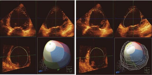 声学定量(acoustic quantification, AQ)也称心内膜自动边缘检测。通过计算机技术将未经滤波的超声数据分为组织及血液成分,自动显示血液/组织界面。通过选定感兴趣区,可实时计算面积及变化率从而得出心脏泵血功能和心肌收缩指标。