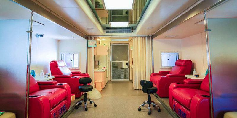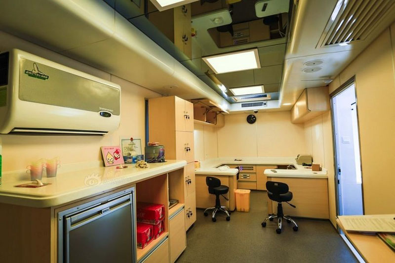 献血房车里面必须配备消毒设备比如医用空气消毒机等,保证献血环境安全。此外,每天献血房车卫生的打扫,一些器材的配备都要满足一人一用比如说针头之类的。其次,温馨舒适的环境会让献血的人能够充分放松。如今的献血房车都会配备冷暖空调、液晶电视、冰箱等设备,每个去献血的人都能感受到家一般的温馨舒适,而且里面还有准备一些零食和糖果,要是献血者感到紧张就可以吃点甜点缓解情绪。